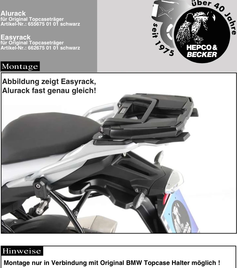 - zur Aufnahme des Aluminium Standard Topcases 35 wird ein spezieller Bügel benötigt (Artikelnummer: HB700007350 oder HB700007351)