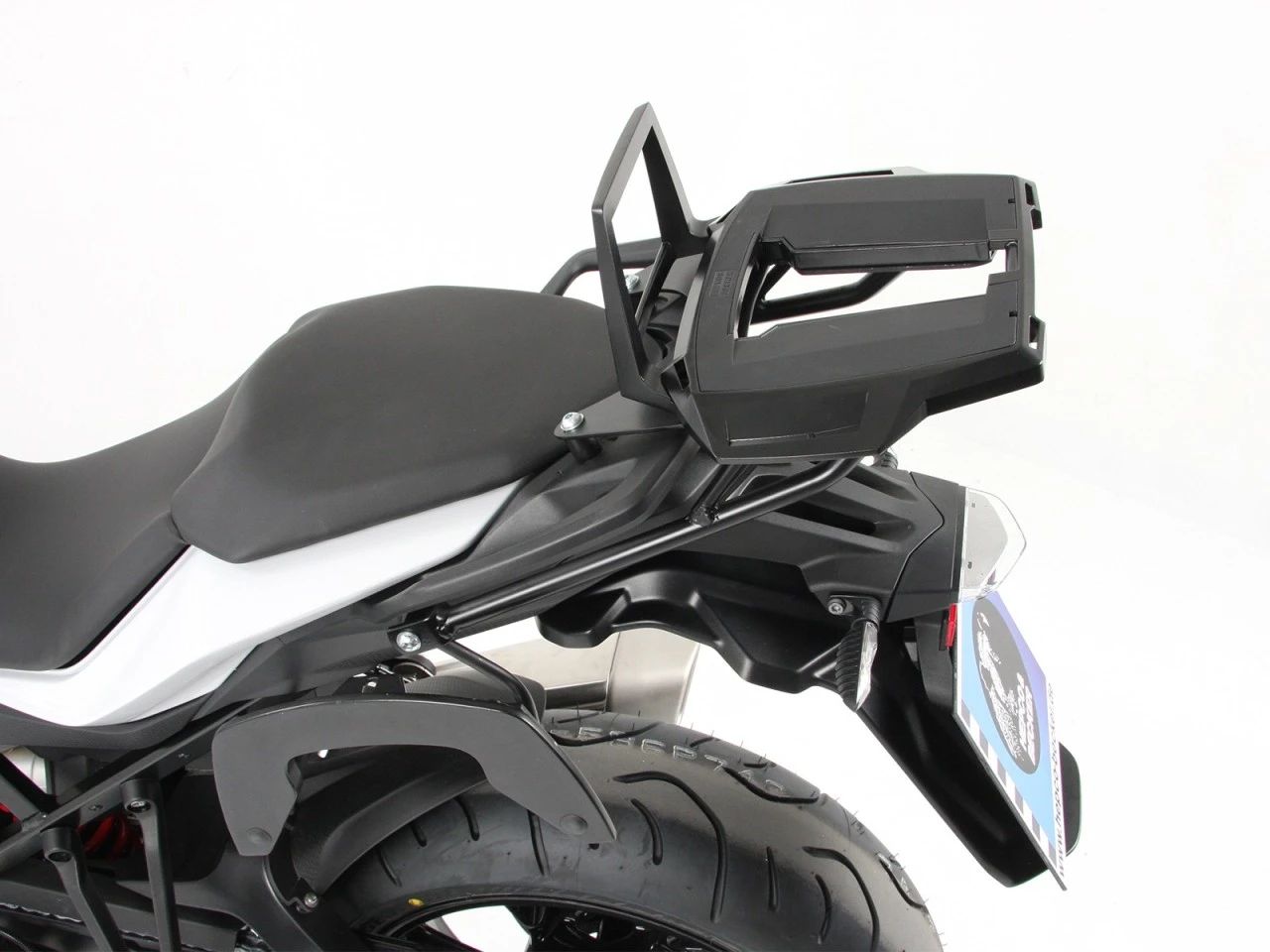 Motorradmodellspezifischer Halter zur Aufnahme von Hepco&Becker Topcases (Topcases mit Universalplatte passen nicht).Topcaseträger bestehend aus einem modellspezifischen Anbaukit und der Alurack Adapterplatte zur Aufnahme von Hepco&Becker Topcases oder Softgepäck (nicht passend für Topcases mit Universal Kunststoffplatte).