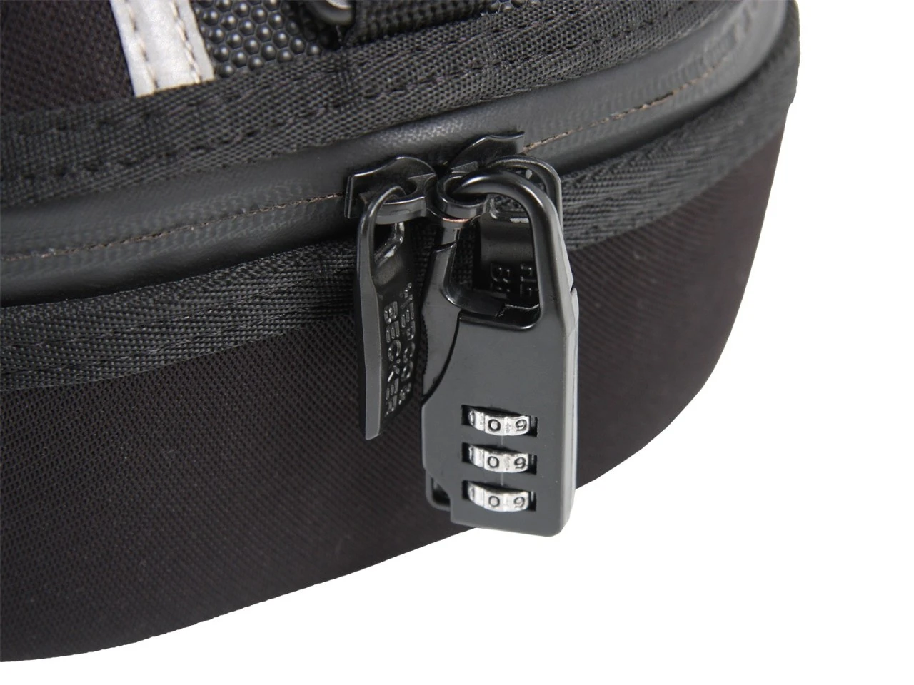 zur optionalen Ergänzung – diese Diebstahlsicherung wird im Inneren des Tankrucksacks oder Hecktasche montiert und verhindert, dass der Tankrucksack von außen durch die Lock-it Verriegelung geöffnet werden kann. Der Deckel des Tankrucksacks wird zusätzlich mit dem beiliegenden Zahlenschloss verriegelt.