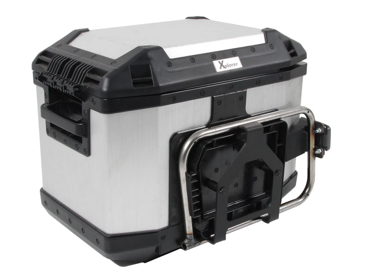 Stabile Zusatzsicherung für’s Gelände. Dieses stabile Sicherungsset kann zusätzlich am Xplorer Cutout Koffersystem montiert werden. Somit sind die Koffer nicht nur durch das Metallhalteschloss, sondern ebenfalls durch eine 3-Punkt Stahlkonstruktion gesichert. Dieses Sicherungsset wird im Inneren des Koffers mit Schrauben befestigt, welche man einfach mit der Hand lösen kann, sollte man den Koffer doch irgendwann abnehmen möchten.