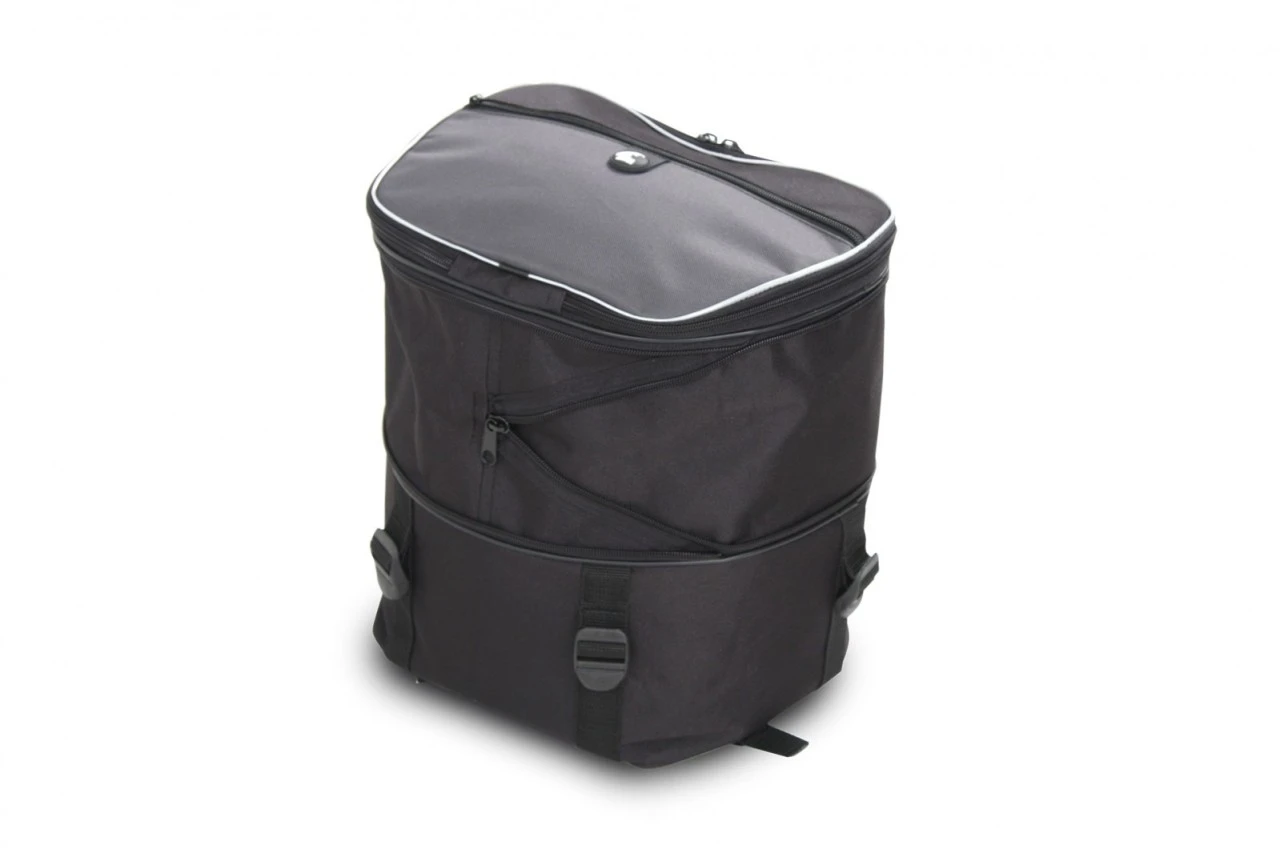 Stoff-Hecktasche zur Gurtbefestigung auf verschiedenen Heckträgern. Nicht wasserdicht. Praktisch und durchdacht: auf dem Soziaplatz sicher befestigt, wird die Gewichtsverteilung nicht negativ beeinflusst und die Maschine bleibt neutral und fahraktiv. Durch Reißverschluss und Kompressionsgurte bietet sie ein variables Volumen bis zu 25 Litern. Die Ausführung aus beschichtetem Cordura-Gewebe ist wasserabweisend und robust. Mit Tragegriff und Riemen auch als Rucksack oder Umhängetasche verwendbar.