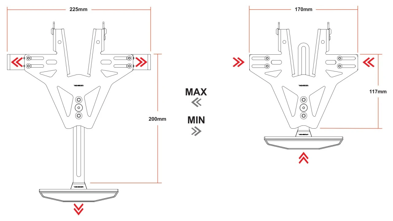 Die Blinkerhalterungen des AKRON-RS sind in der Breite verstellbar und damit für jede Art von Zubehör-Blinkern geeignet. Durch diese Verstellmöglichkeit kannst Du die Position für Deine Blinker den unterschiedlichsten Kennzeichen anpassen. Um die Montage der Blinker ohne Trennung vom Kabelbaum zu ermöglichen, sind die 10 mm Bohrungen zur Seite hin geschlitzt.