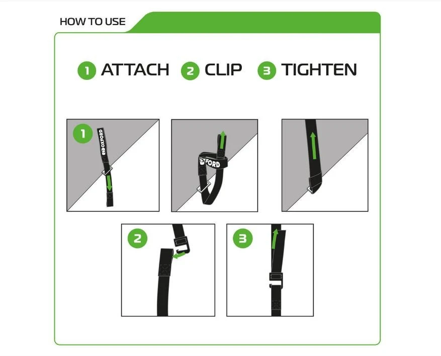 Stärker und viel sicherer als ein Bungee sind die verstellbare, selbstspannende Gurte von Oxford. Ihr extra starkes, flaches Gurtband-Design lässt sich leicht auf die gewünschte Länge einstellen und der G-Schnellverschluss ermöglicht ein einfaches Abnehmen. Der Gurt hat einen elastischen Abschnitt, der den Gurt unter konstanter Spannung hält und im Vergleich zu normalen festen Gurten einen sichereren und sichereren Halt bietet.
