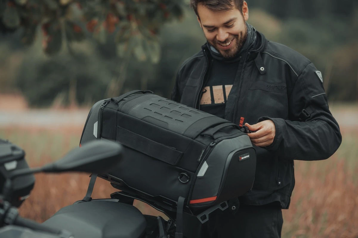 Das robuste PRO Rackpack wurde gezielt für den Einsatz auf Gepäckträgern entwickelt und ist in Kombination mit dem Schultergurt eine praktische Reisetasche. Es lässt sich in Verbindung mit der Gepäckbrückenerweiterung problemlos auf dem STREET-RACK oder dem ADVENTURE-RACK sowie auf Standardträgern, Soziussitz oder an einer Sissybar befestigen.