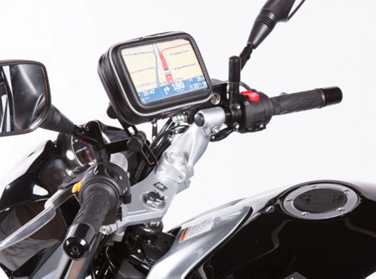 Halterung für Navigationsgeräte/GPS zur universellen Befestigung am Lenker. Ein perfektes Zubehör für alle 2-Radfahrer, die gerne Langstrecken fahren oder auch nur in der Stadt unterwegs sind. Ihr Navi/GPS wird in einer sehr robusten und wasserfesten Tasche geschützt. Durch verschieden starke Schaumstoff-Inlays kann jedes Navi/GPS optimal in der Tasche fixiert werden. Der Halter ist mit einem feststellbarem Kugelgelenk ausgestattet. Somit kann das Display perfekt und schnell positioniert werden, so dass der Sichtwinkel für Sie immer richtig ist. Die wasserfeste Tasche und der wasserfeste Reißverschluss ermöglichen den Einsatz bei jedem Wetter. Ihr Touch-Screen Display wird durch eine spezielle Folie geschützt!
