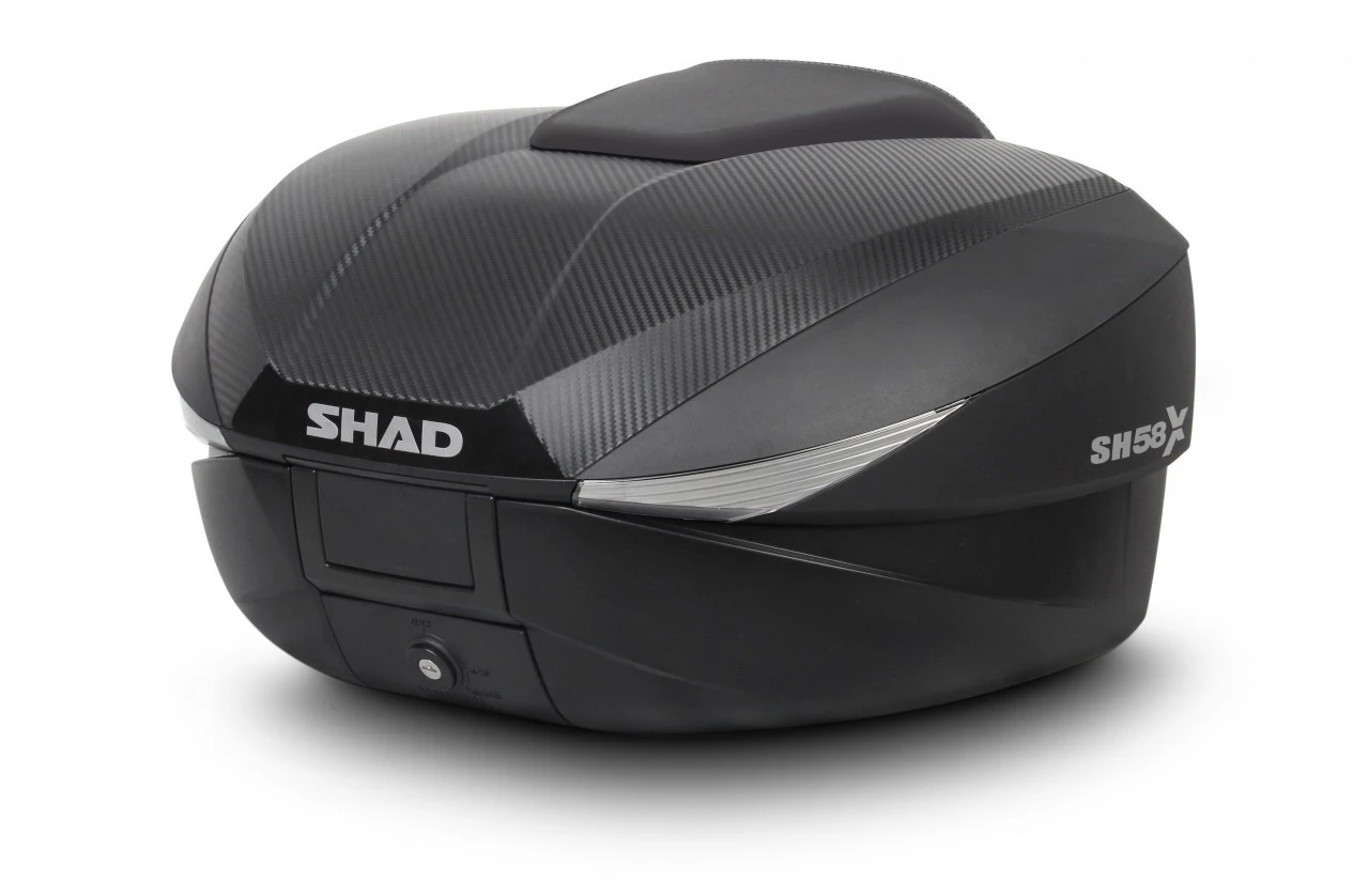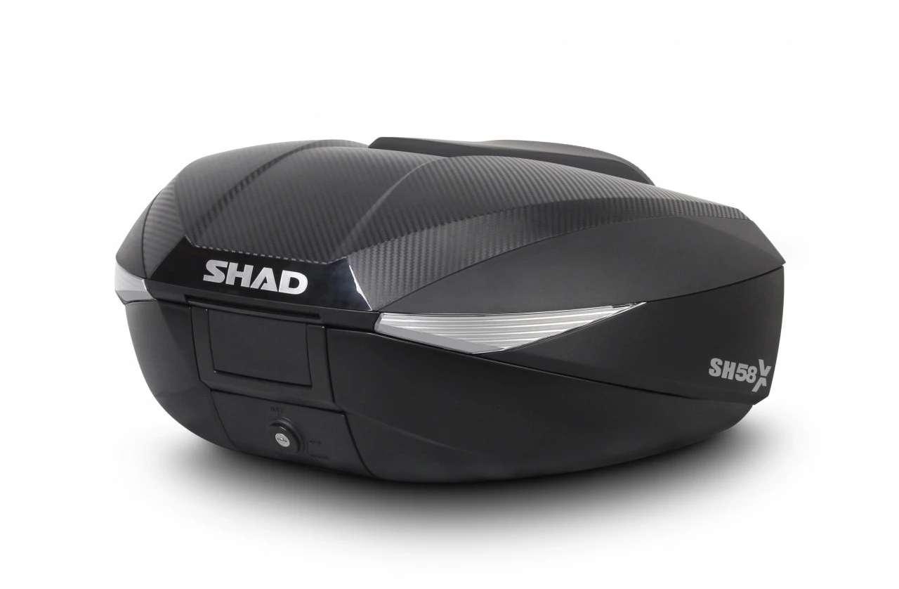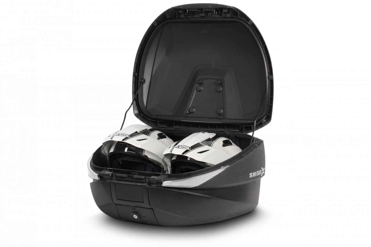 Erweiterbar durch SHAD, mit in 3 Positionen einstellbarem Volumen und Platz für 2 Integralhelme. Dieses verstellbare Topcase ist aerodynamisch und flach, wenn es vollständig zusammengeklappt ist, lässt sich jedoch in zwei Schritten von 46L auf 52L und schließlich auf 59L erweitern, um maximalen Stauraum zu bieten.